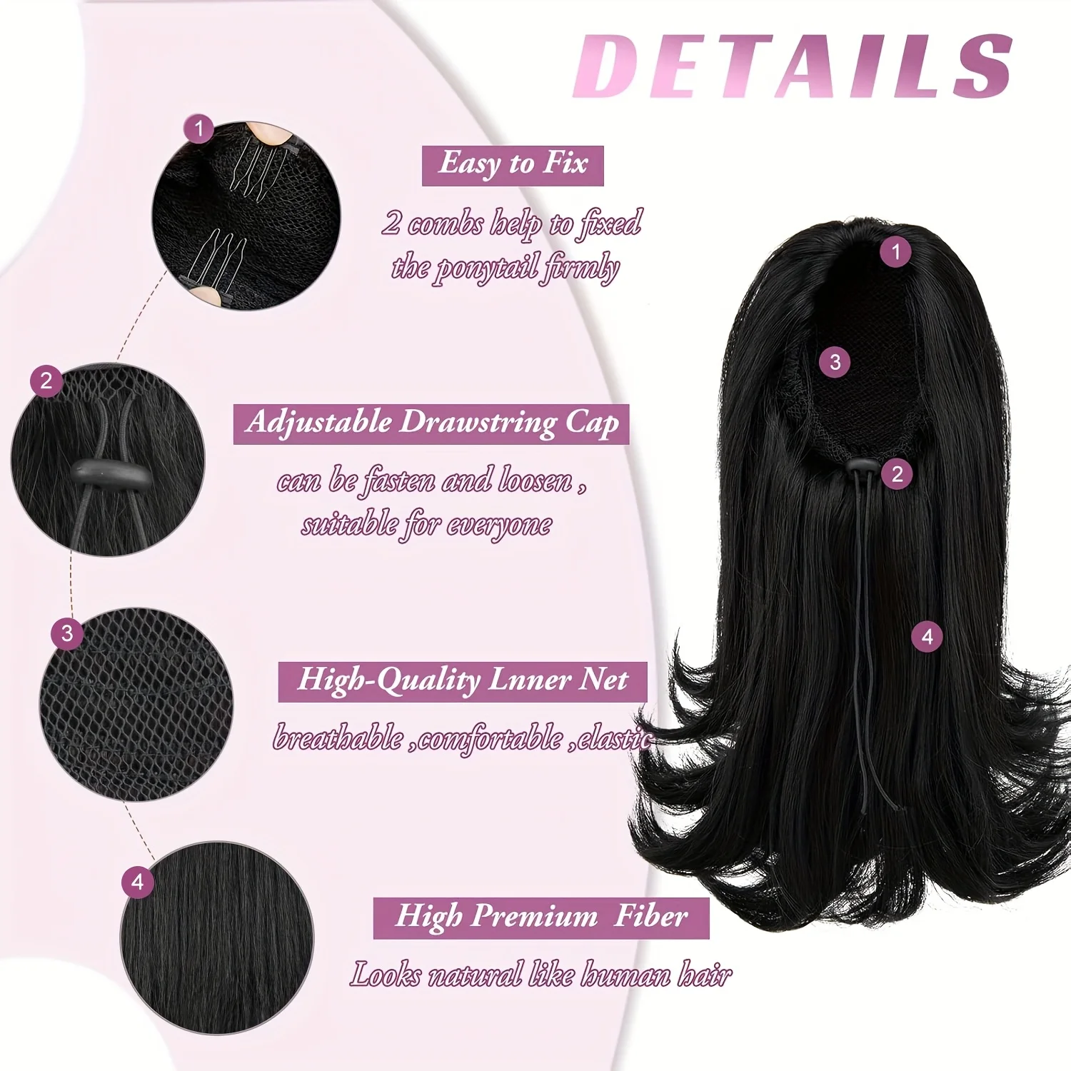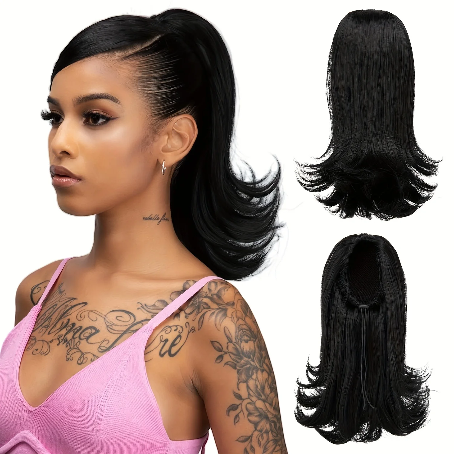 💁🏾♀️ Extensão de Rabo de Cavalo Kinky Liso Texturizado com Cordão – Sintético Preto