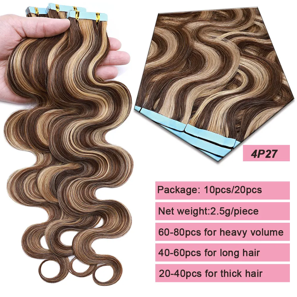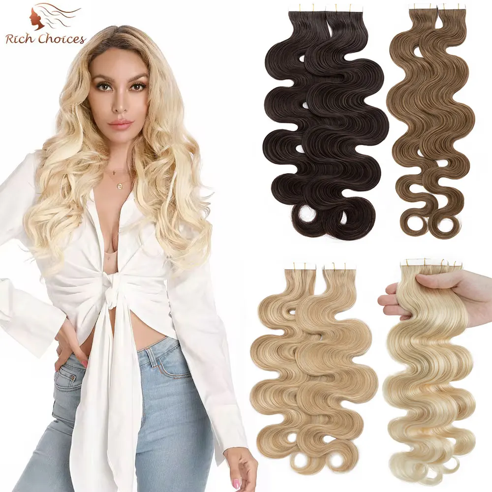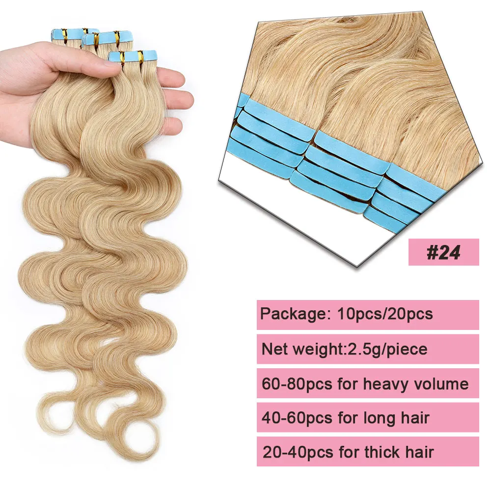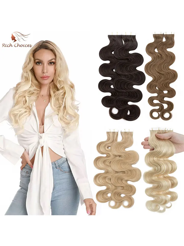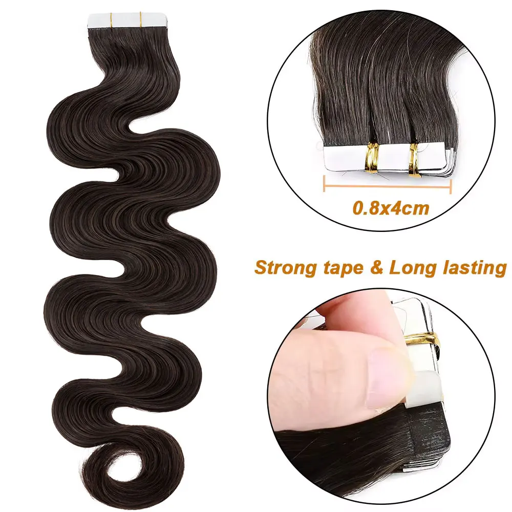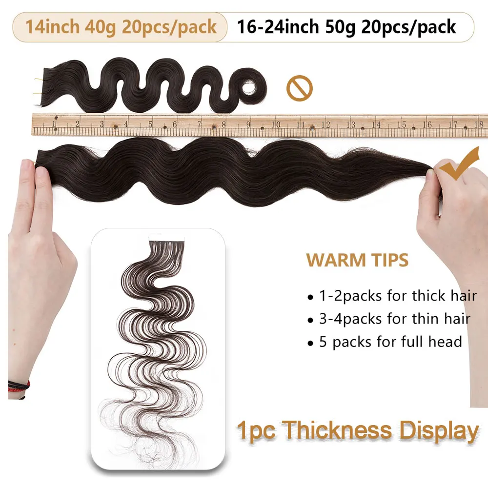 🌟 Extensões Adesivas de Cabelo Humano Ondulado para Mulheres – Fita de Pele Natural, 14 a 24 Polegadas, 20 Peças 🌟