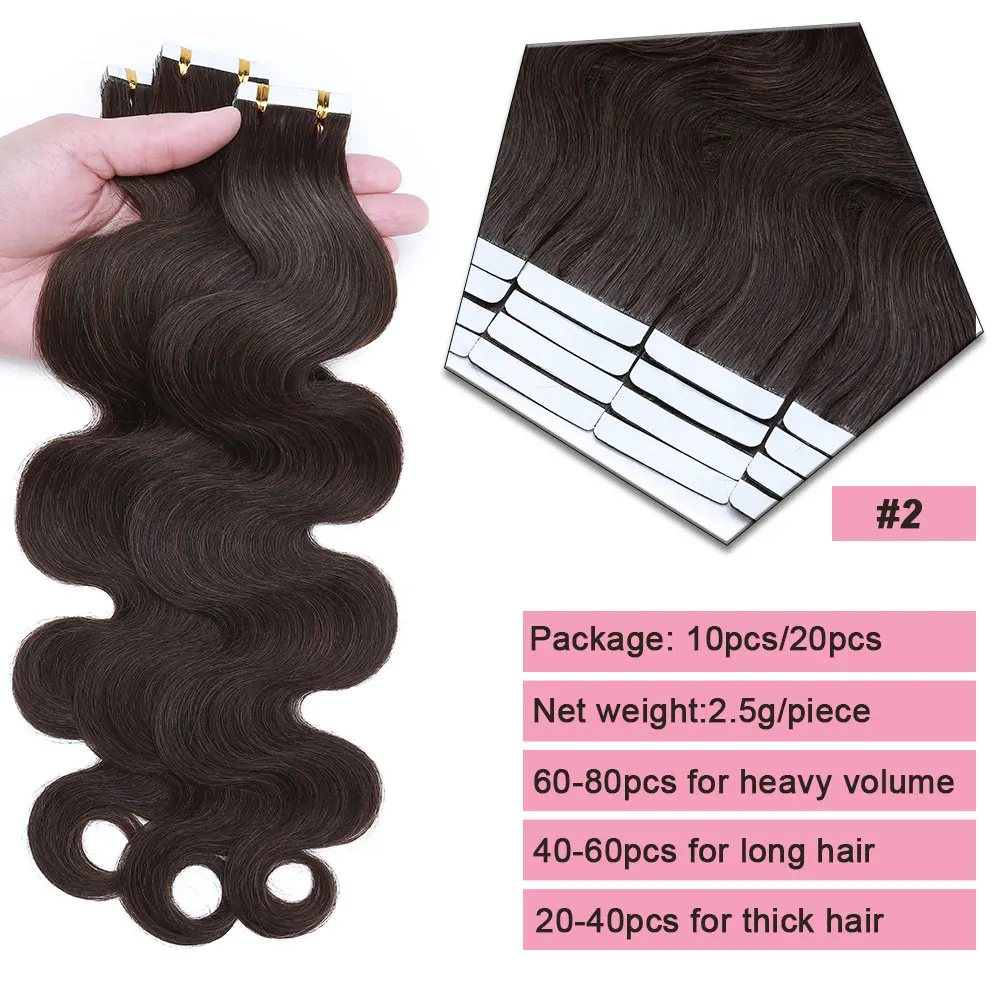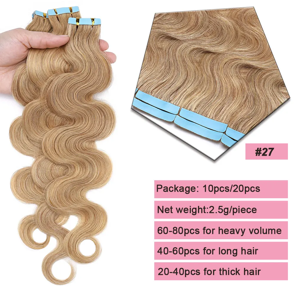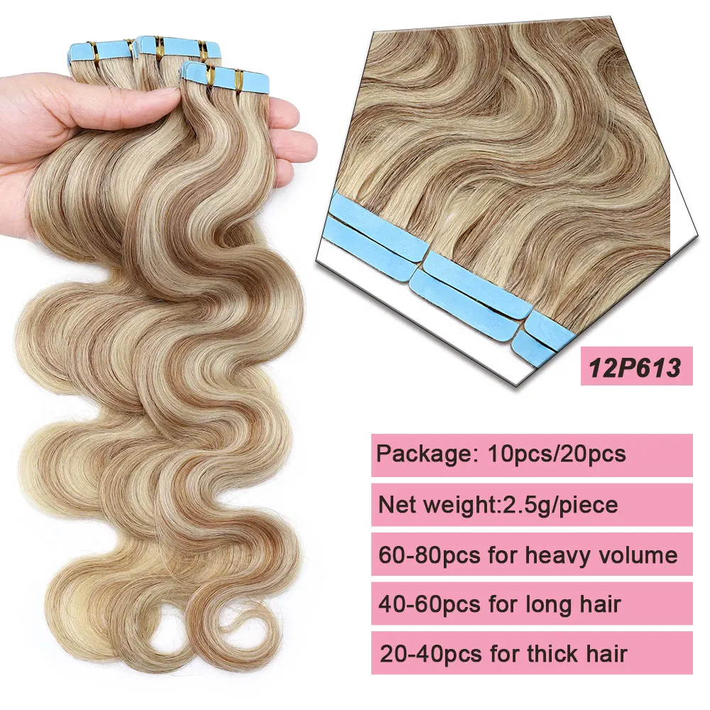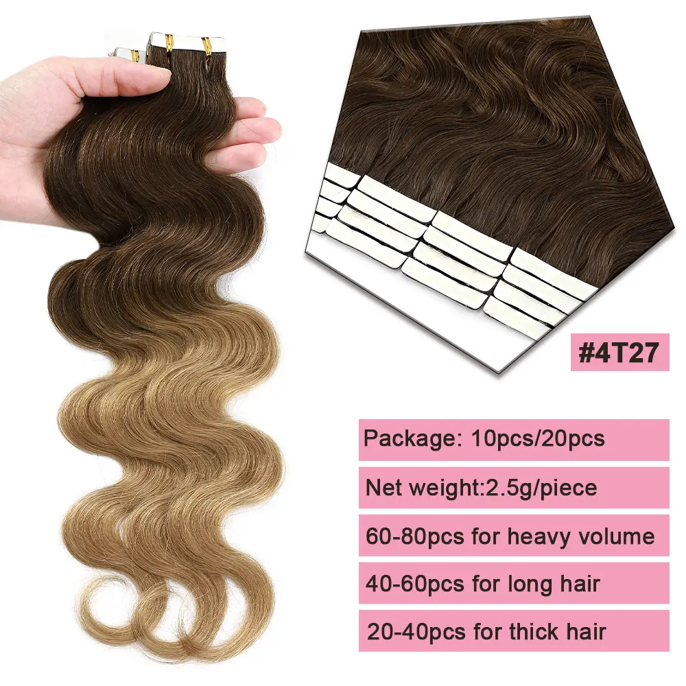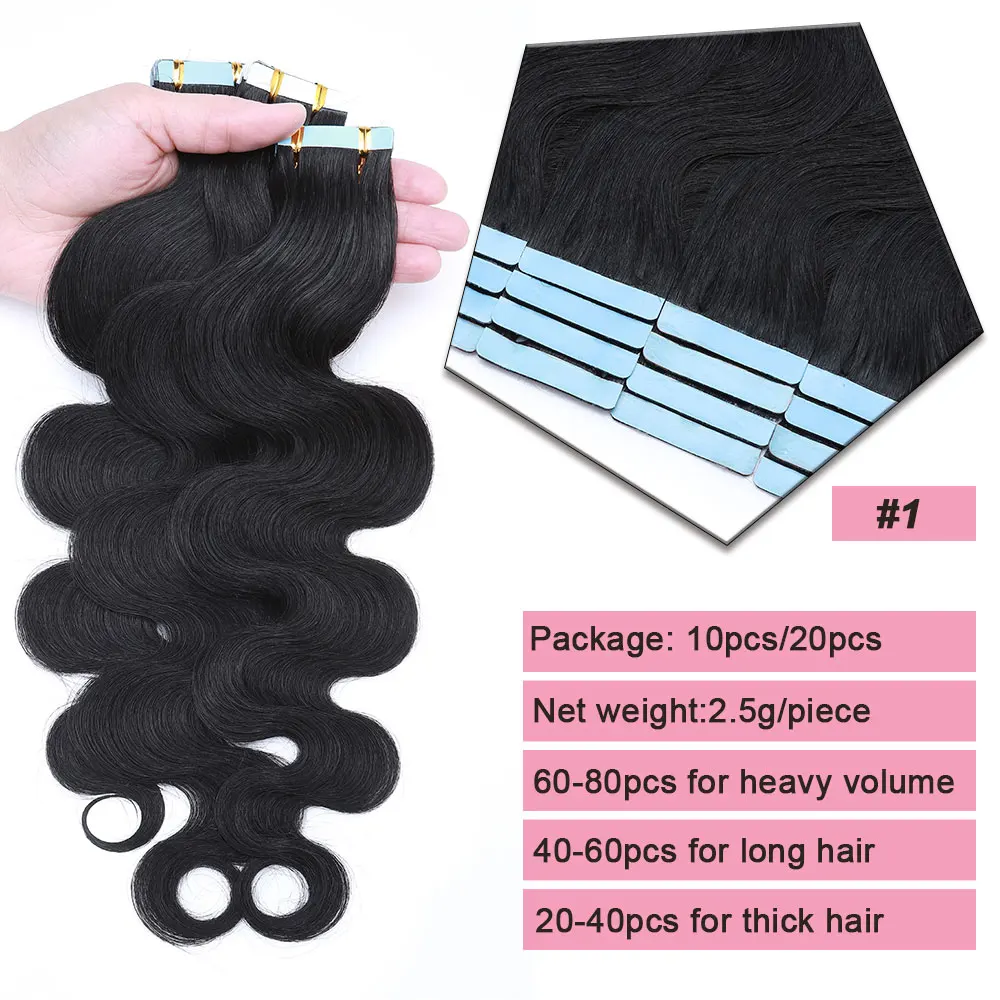 🌟 Extensões Adesivas de Cabelo Humano Ondulado para Mulheres – Fita de Pele Natural, 14 a 24 Polegadas, 20 Peças 🌟