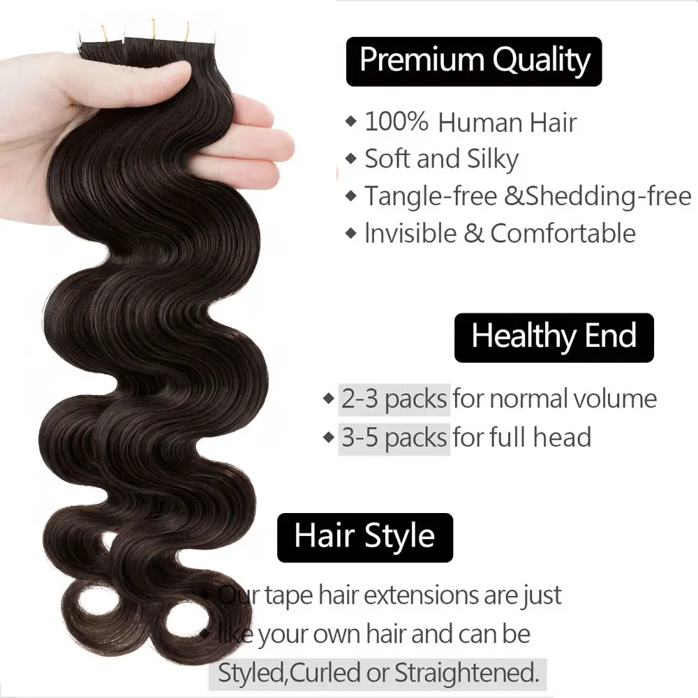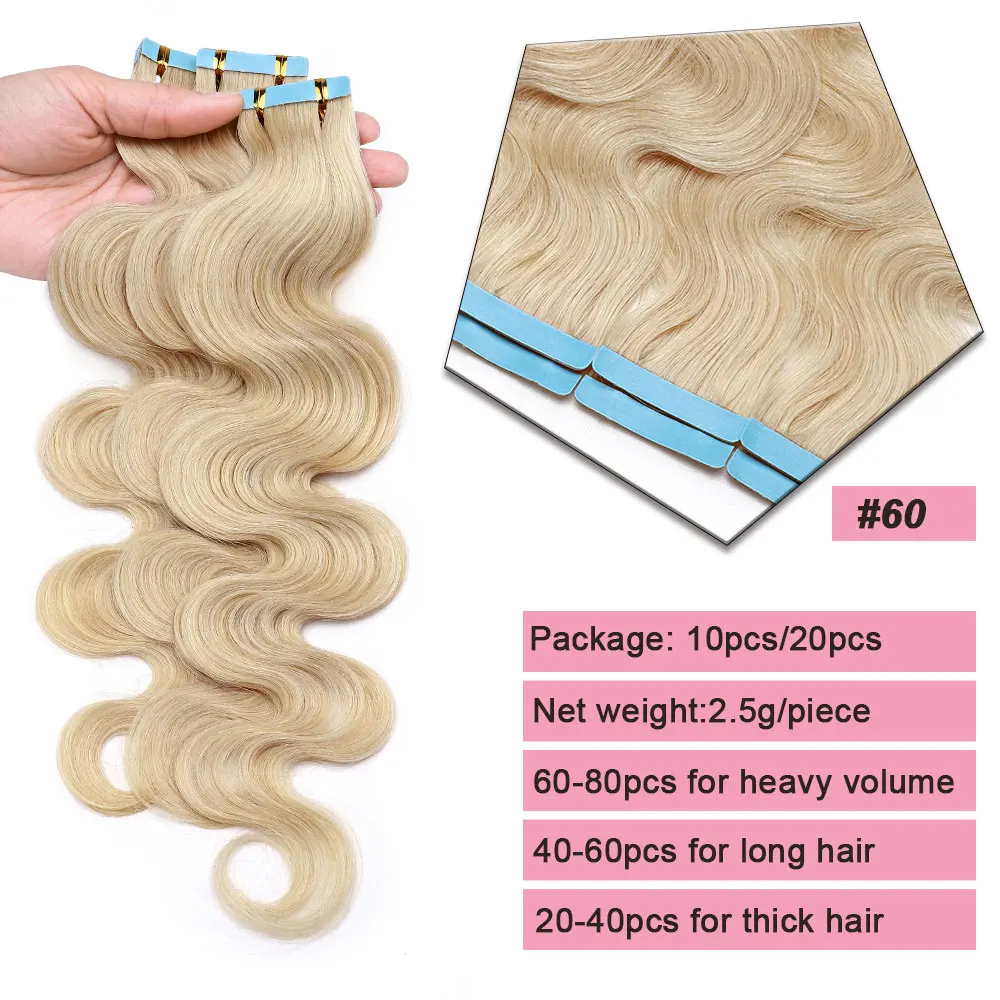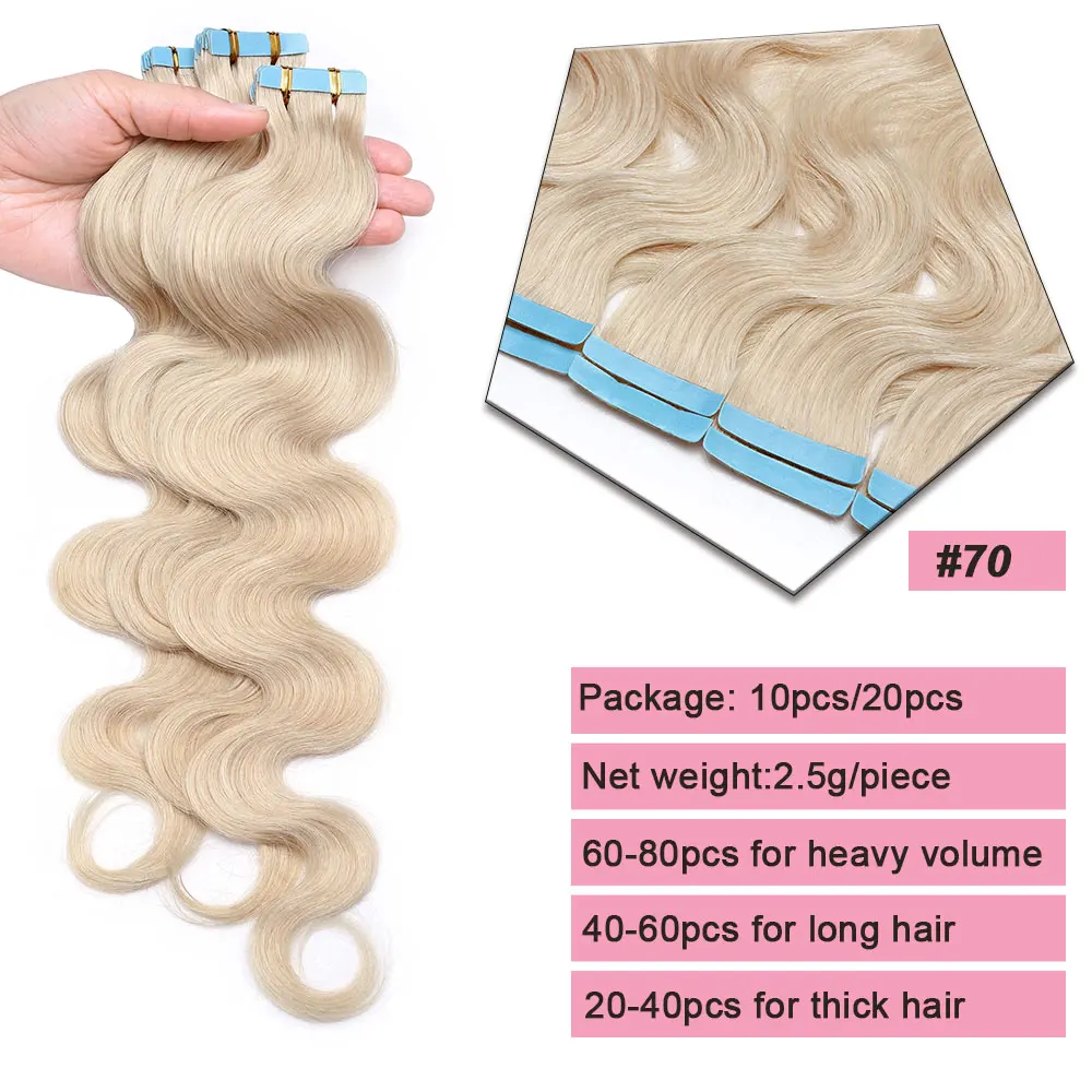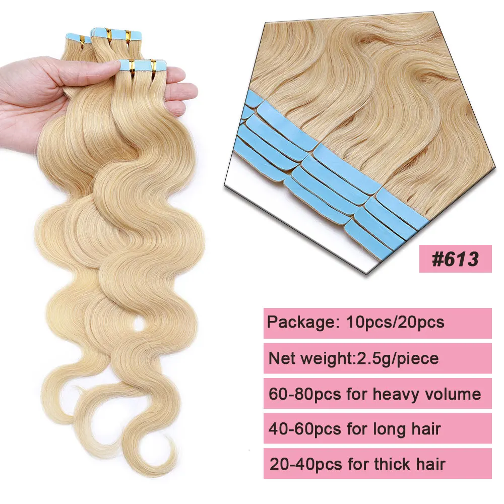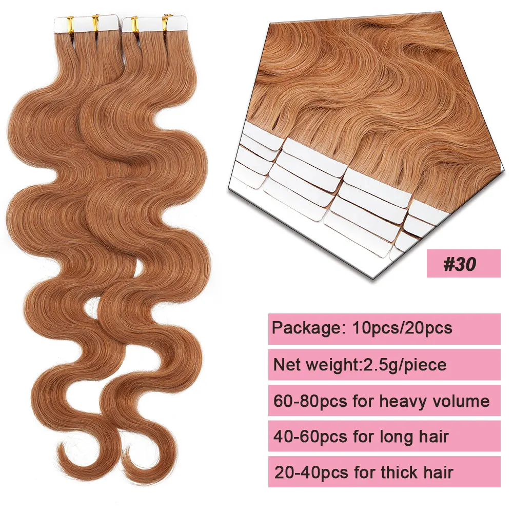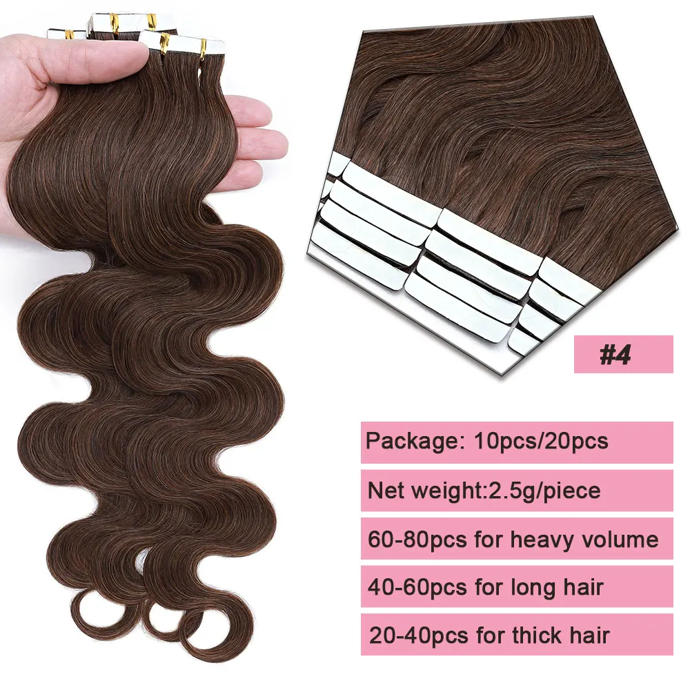 🌟 Extensões Adesivas de Cabelo Humano Ondulado para Mulheres – Fita de Pele Natural, 14 a 24 Polegadas, 20 Peças 🌟