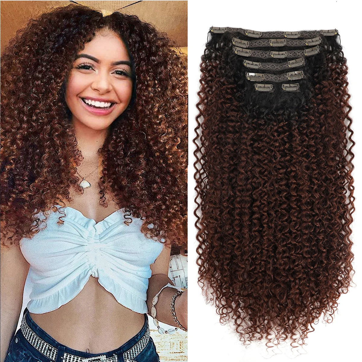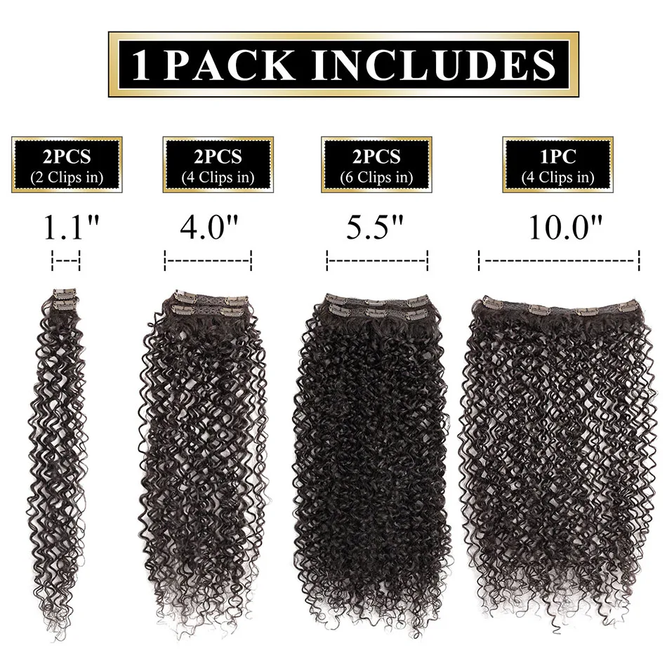 Total: 7 peças com 20 clipes, formando um conjunto completo para cobrir toda a cabeça com volume e cachos perfeitos