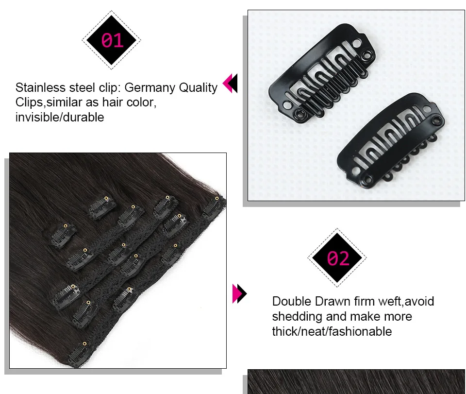 1. super fácil de usar clipe na extensão do cabelo 2. experimento com cor 100% remy cabelo humano 3. comprimento instantâneo, bloquear o cabelo não perda 4. adicionar volume 5. nenhum dano 6. mais opções de penteado |