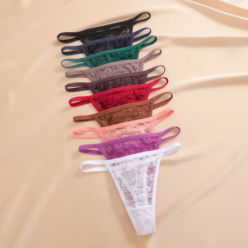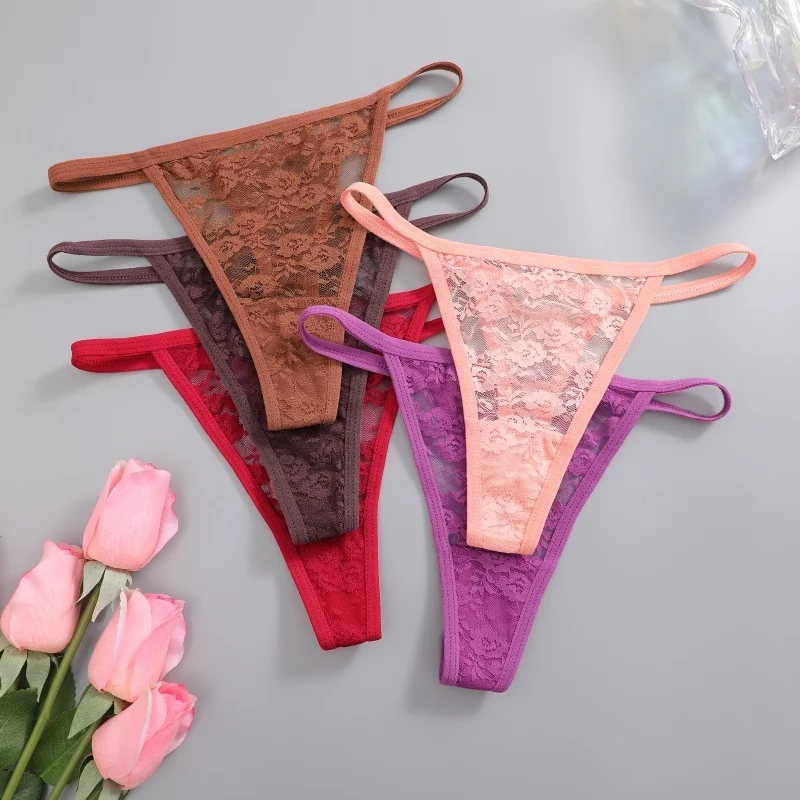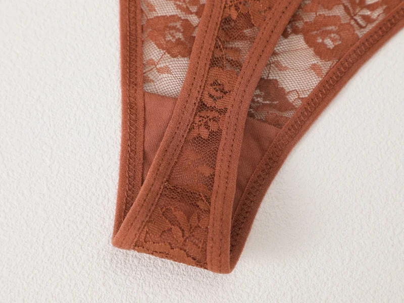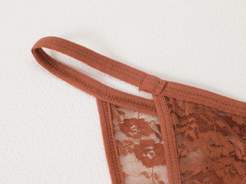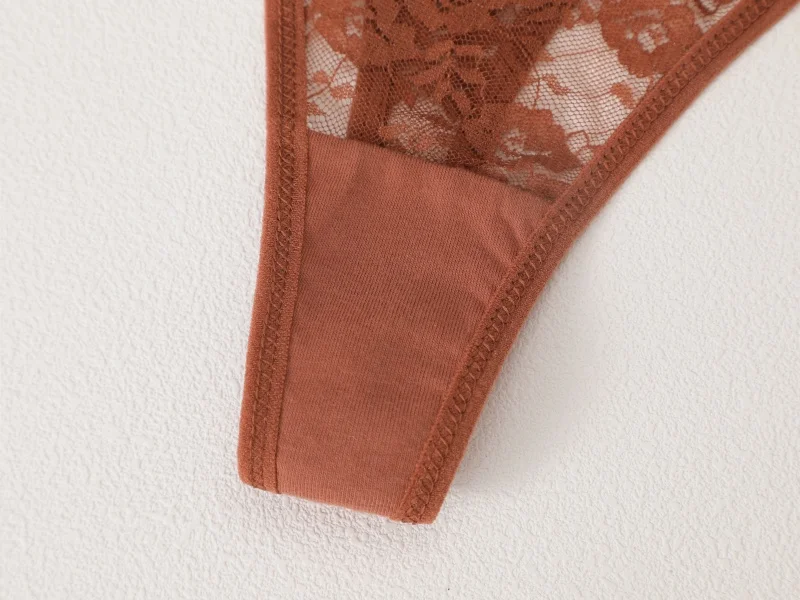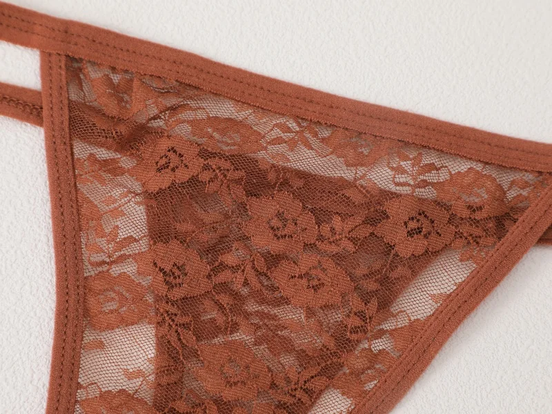 A combinação de renda floral transparente com modelagem fio dental cria um visual moderno e feminino.