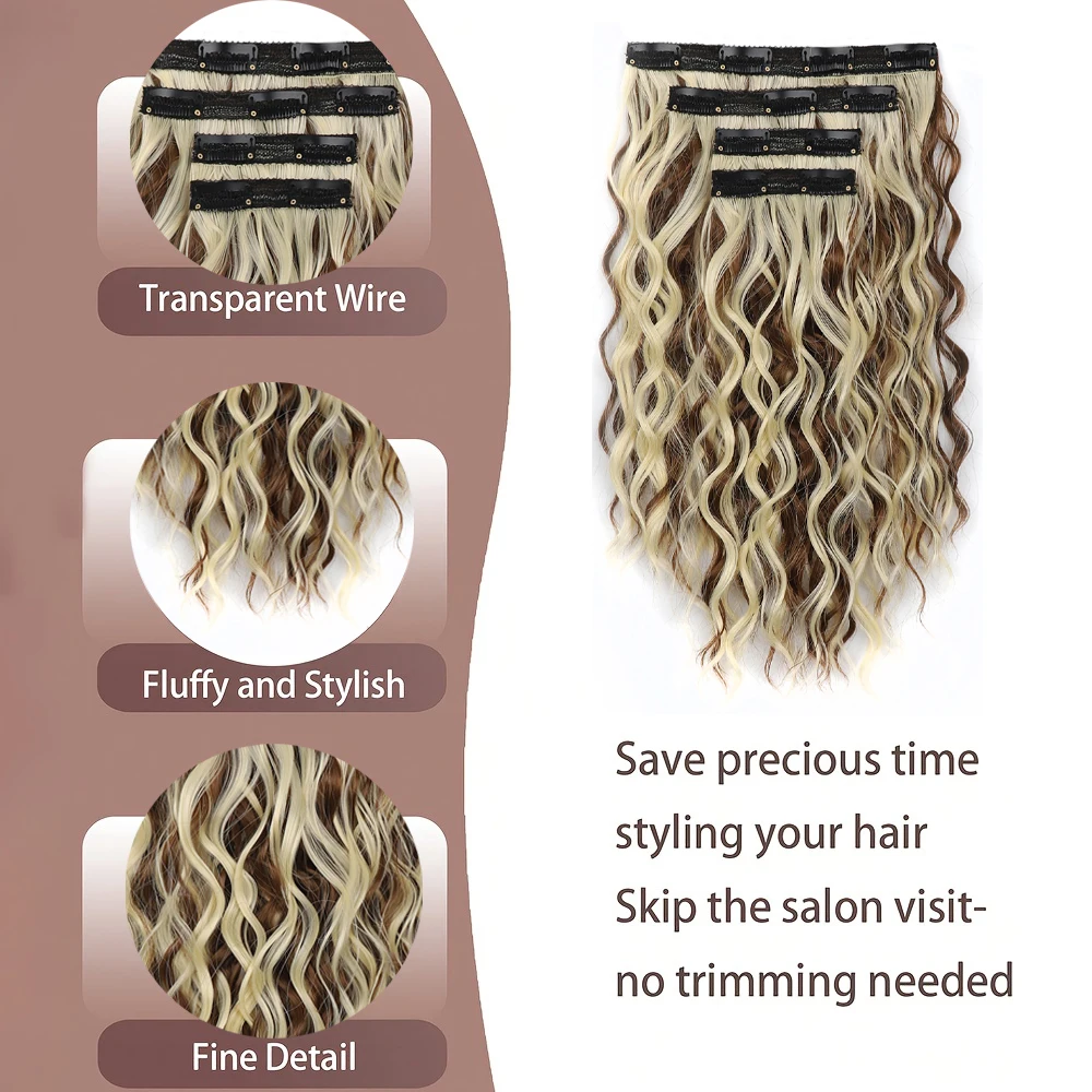 Extensões de cabelo Sintético Kit com 4 Extensões de Cabelo com Presilha 24” 200g Sintético Resistente ao Calor Liso Pontas Cheias Cor Castanho com Mechas Loiro para Mulheres | Loja dos Cabelos