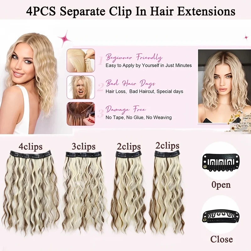 Kit com 4 Extensões de Cabelo com Presilha 12” Sintético Resistente ao Calor Curto Macio Aspecto Natural