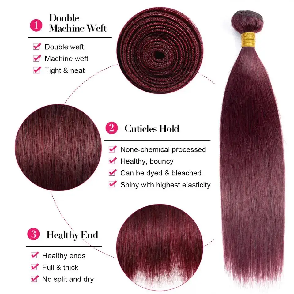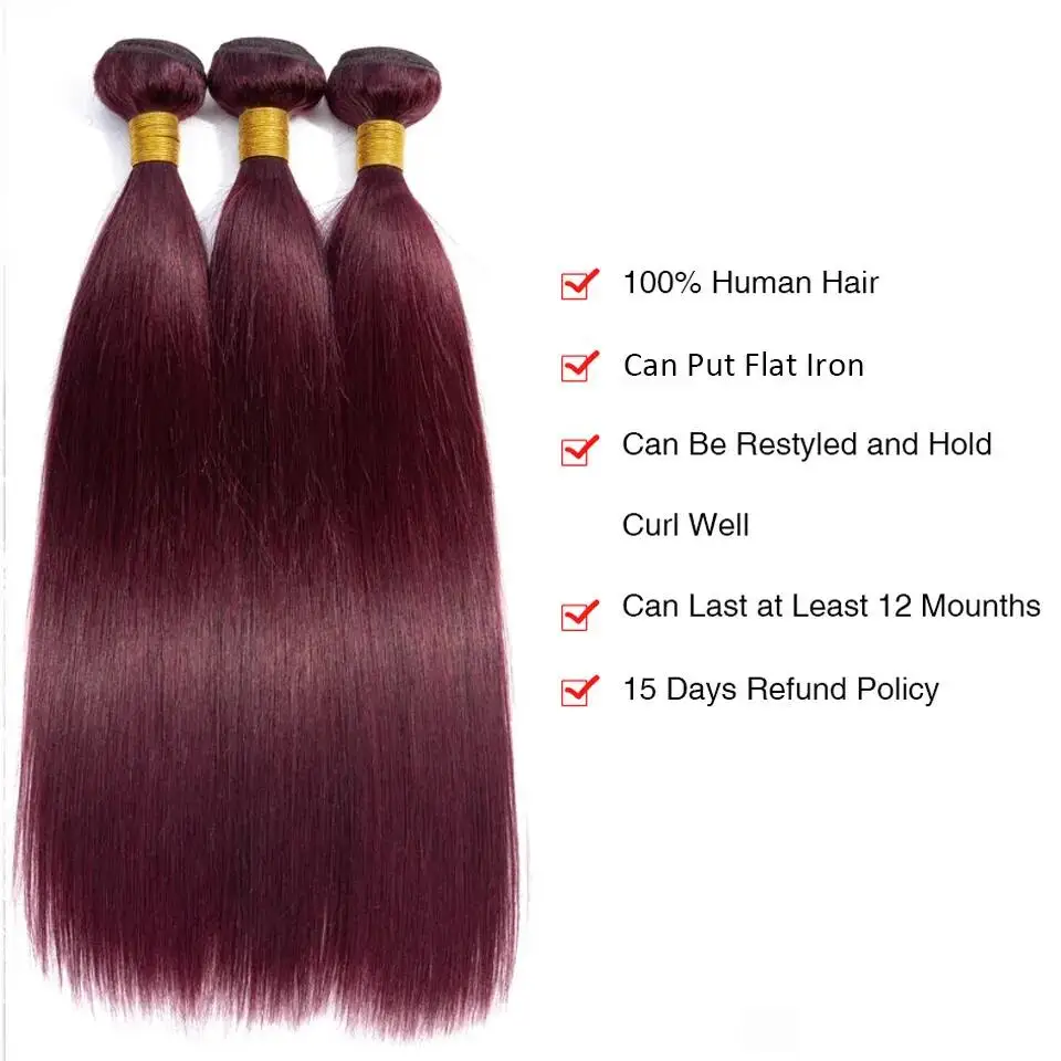 Pacotes de Cabelo Humano Liso Borgonha 99J – Remy Brasileiro, 100% Natural, 3 Peças, 32″, Qualidade Premium 10A