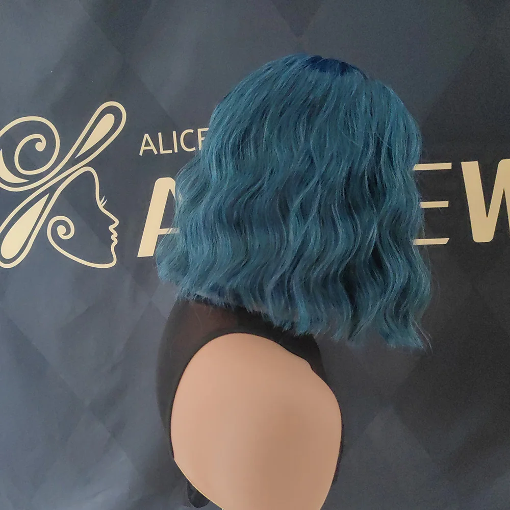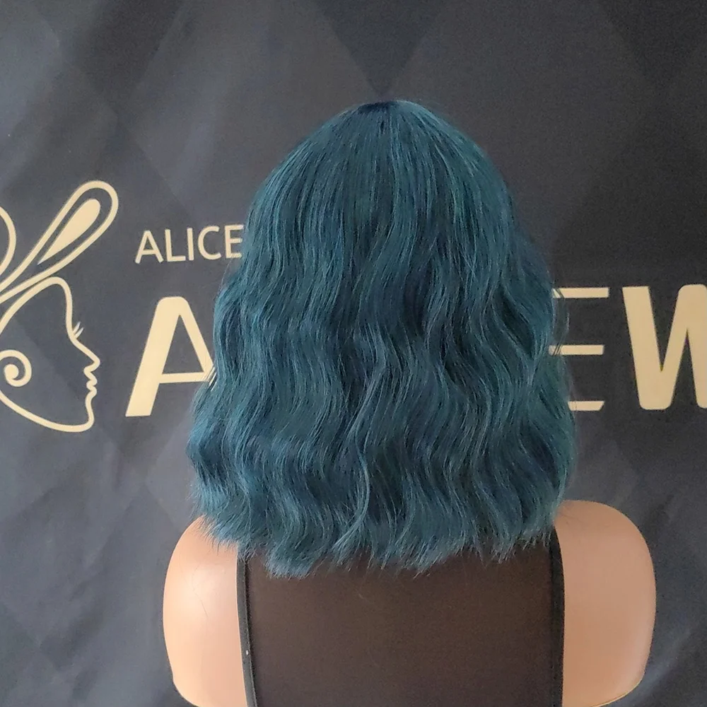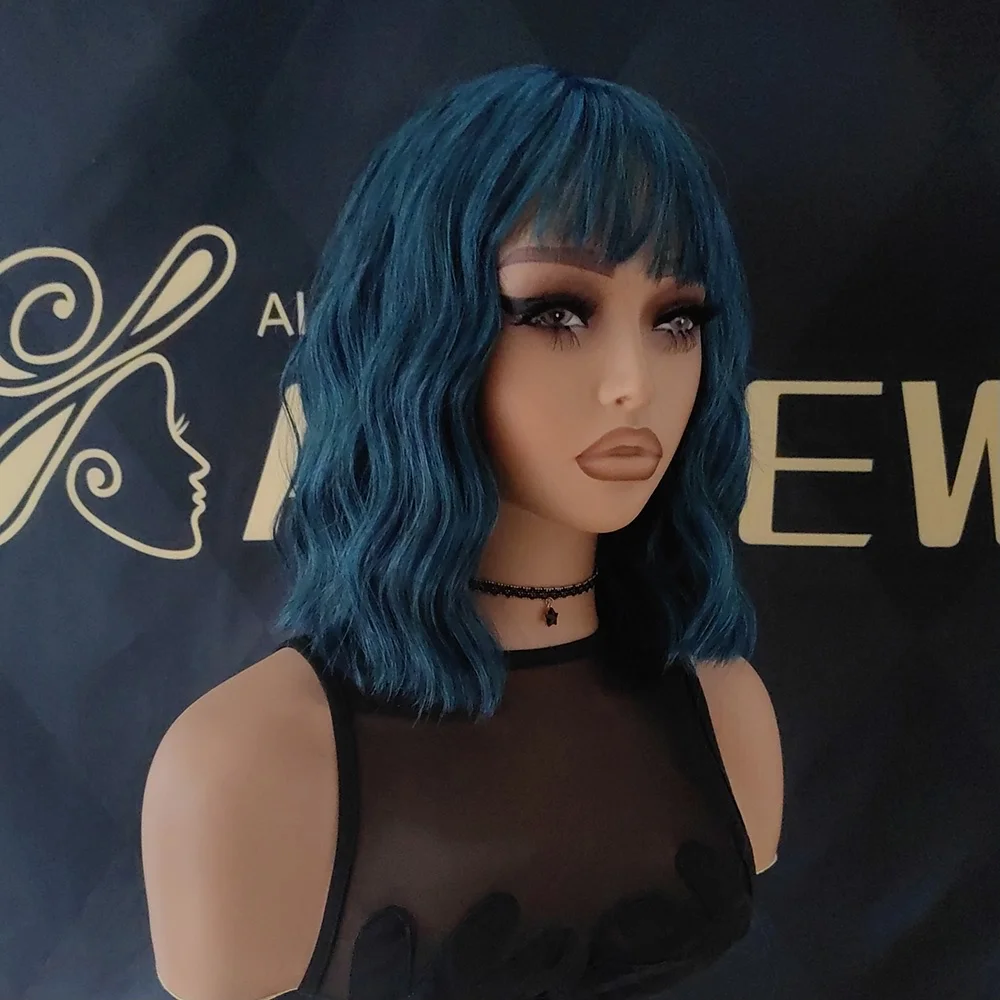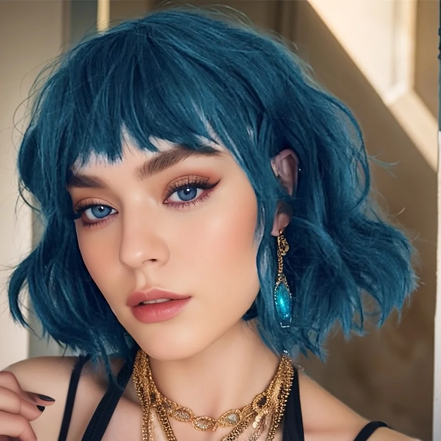 💙 PERUCA CURTA CACHEADA AZUL NATURAL – CORTE BOB ONDULADO COM FRANJA