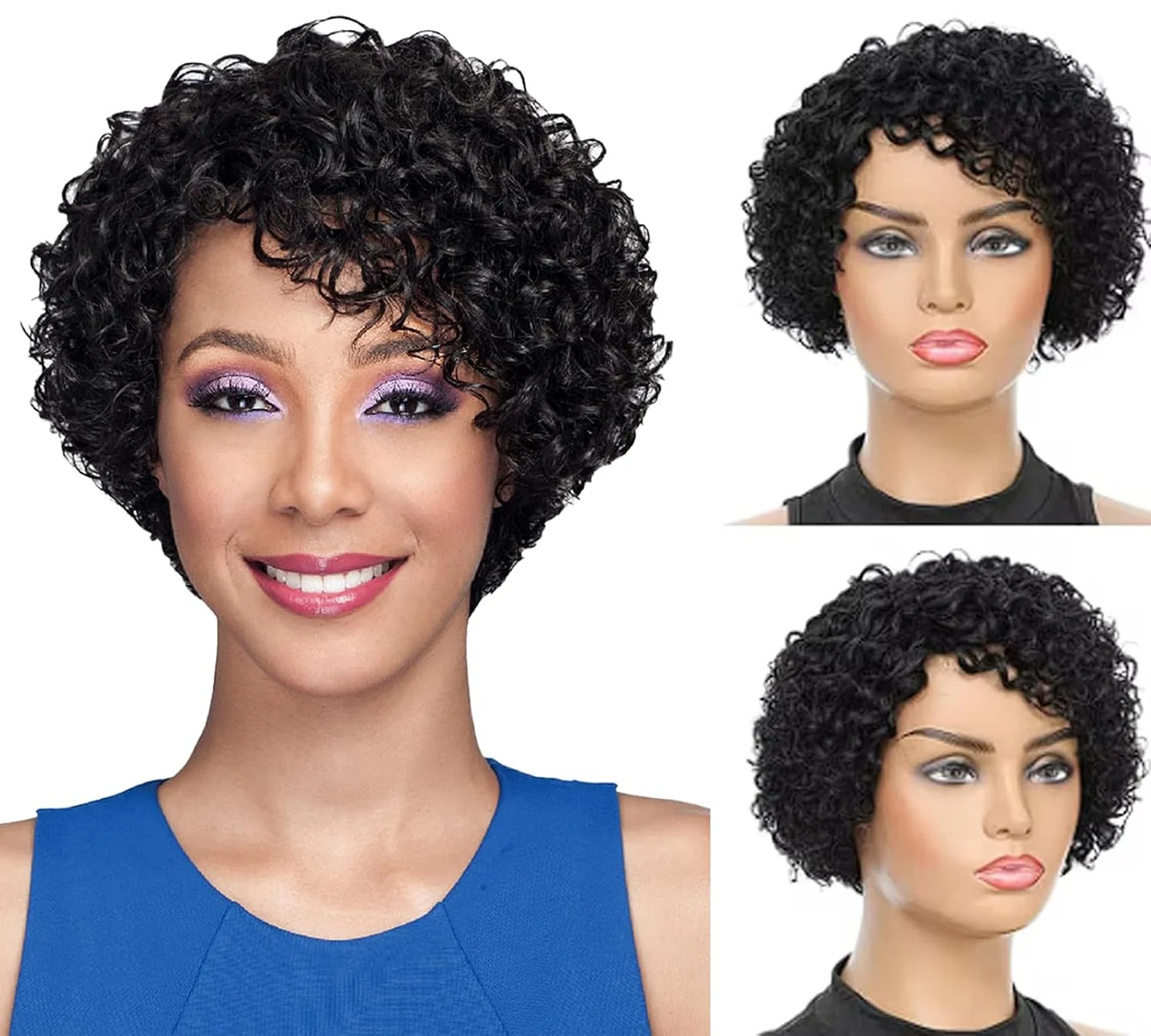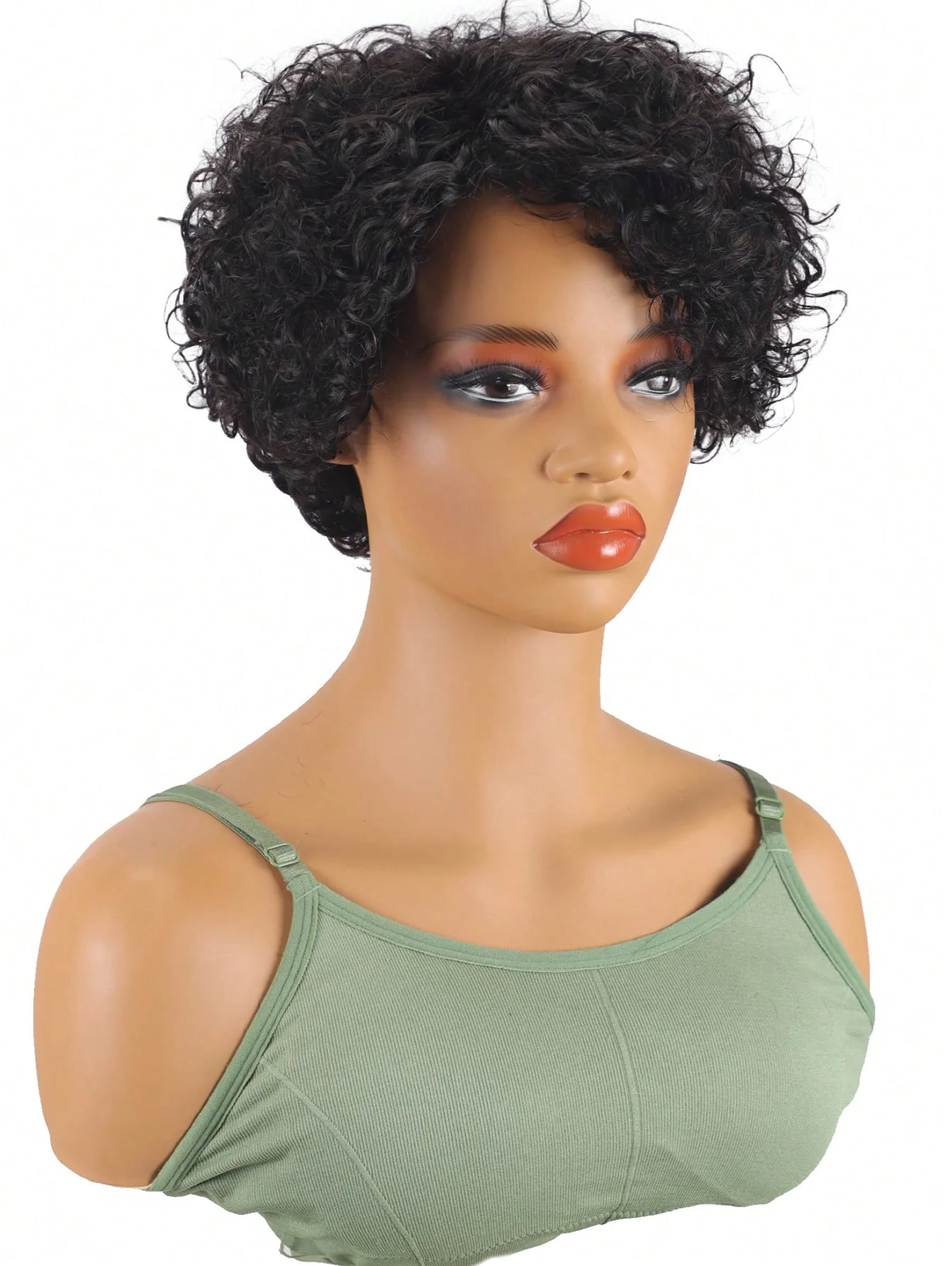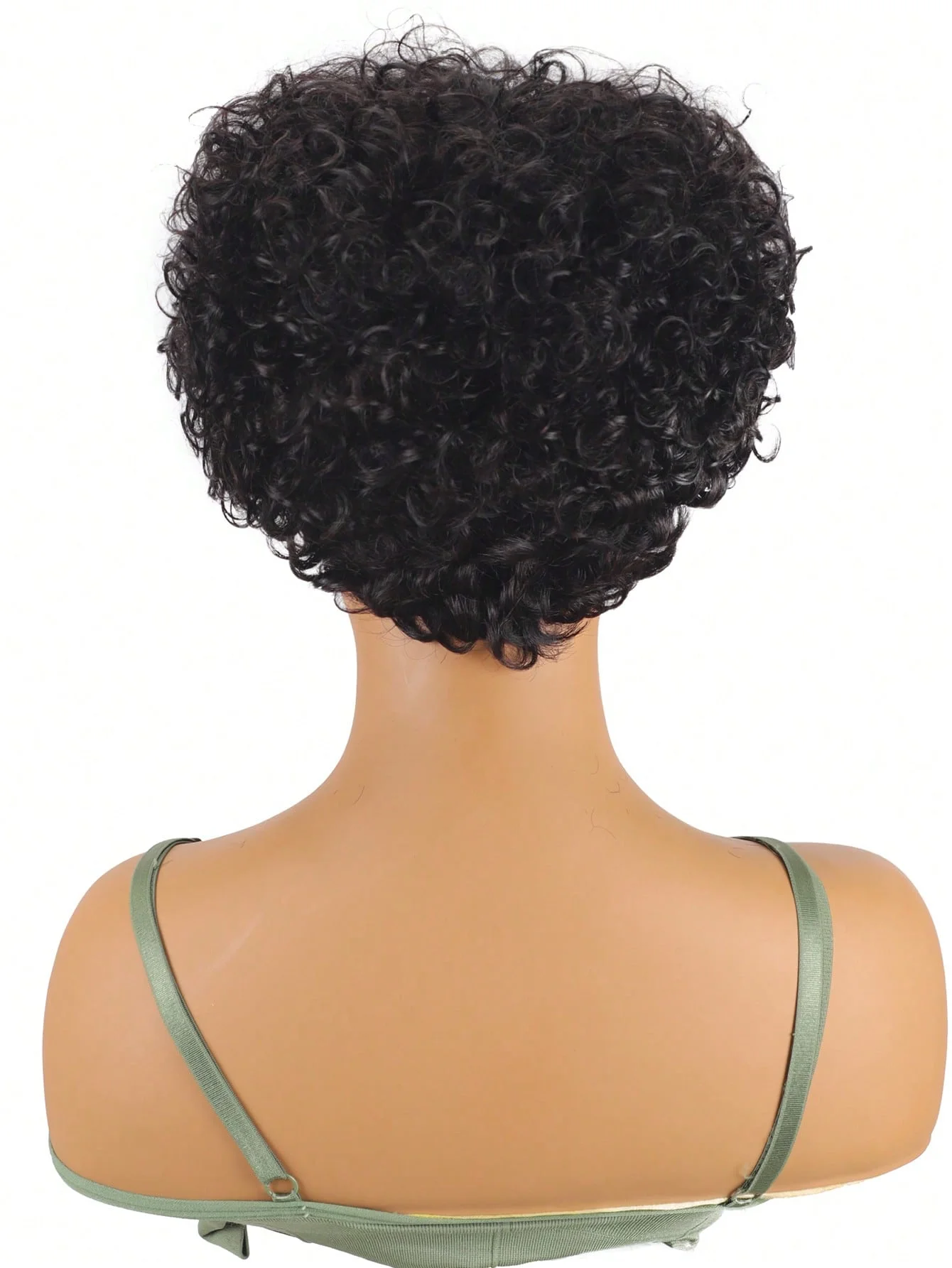 💇🏾♀️ Peruca Curta Encaracolada Estilo Pixie – Cabelo Humano Brasileiro Remy, Modelo Kinky com Volume Natural, Sem Lace e Feita à Máquina ✨