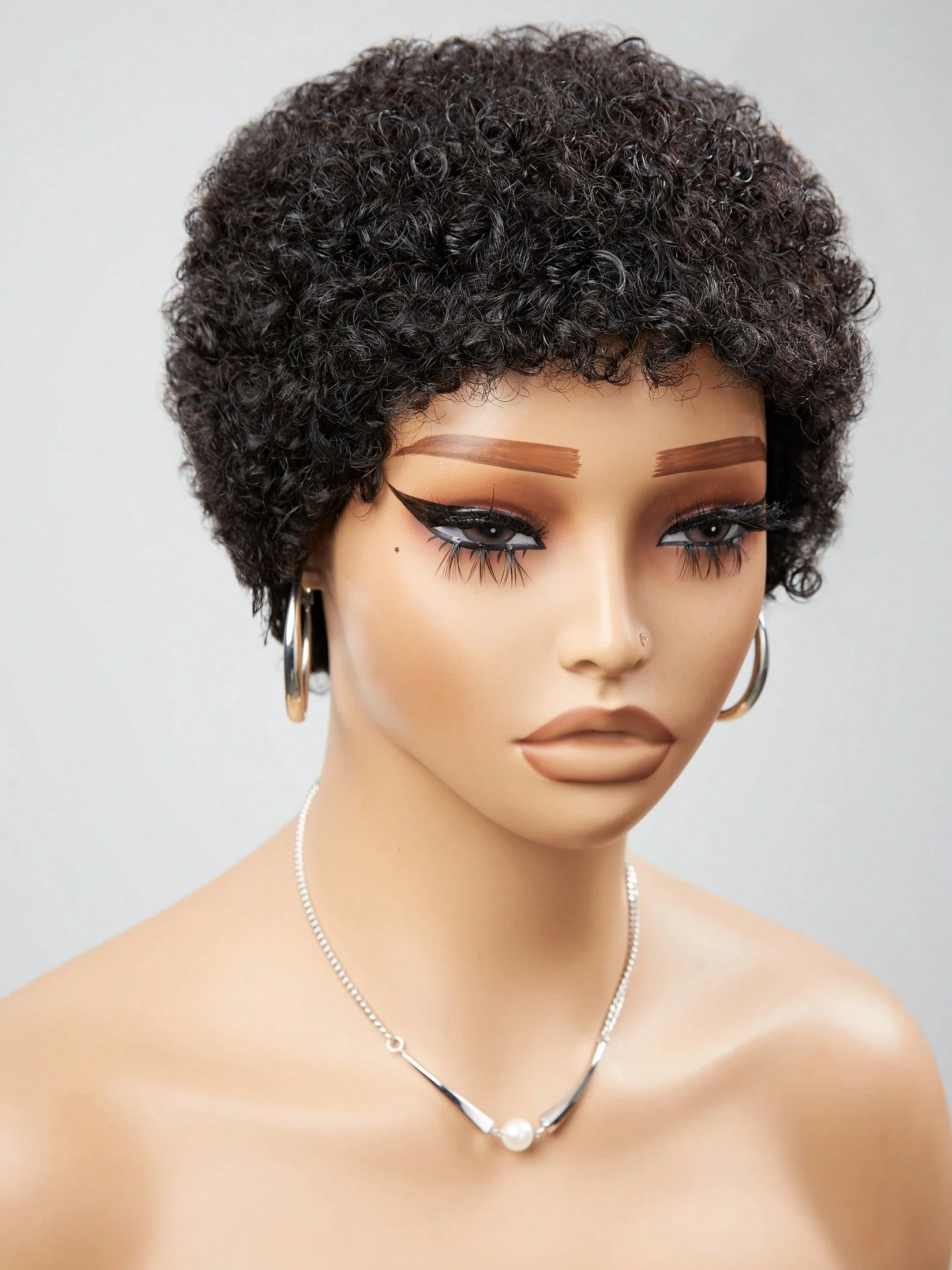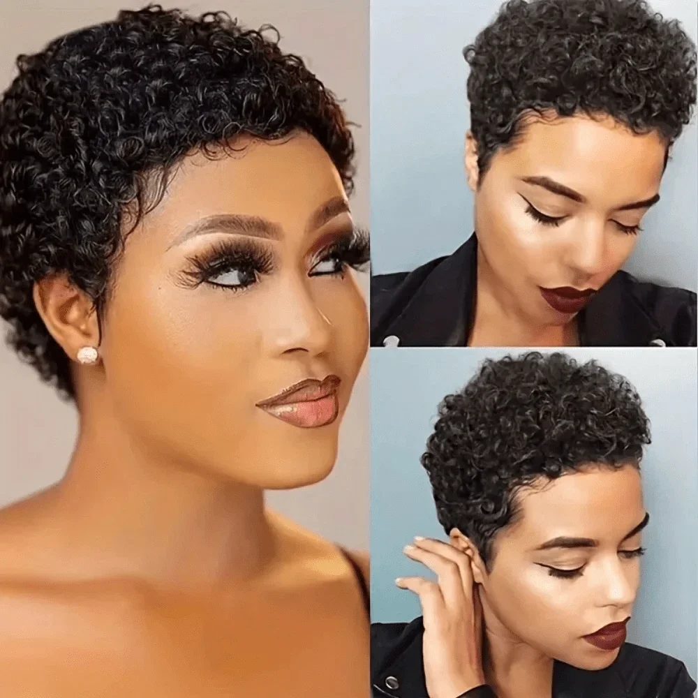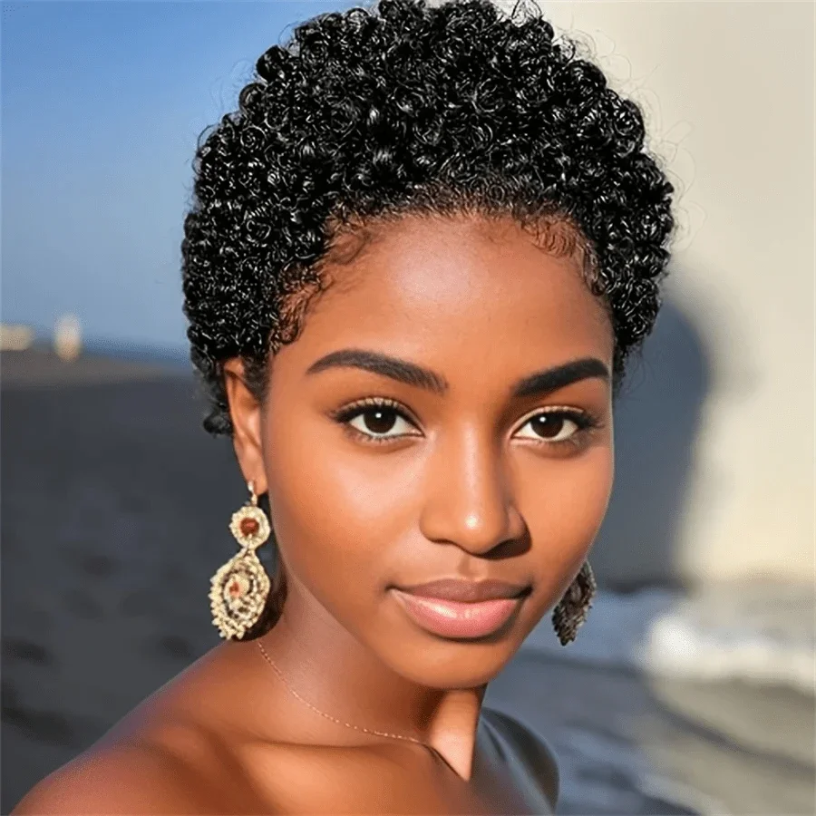 Esta peruca curta Pixie afro cacheada de cabelo humano brasileiro oferece naturalidade, conforto e estilo para qualquer momento.