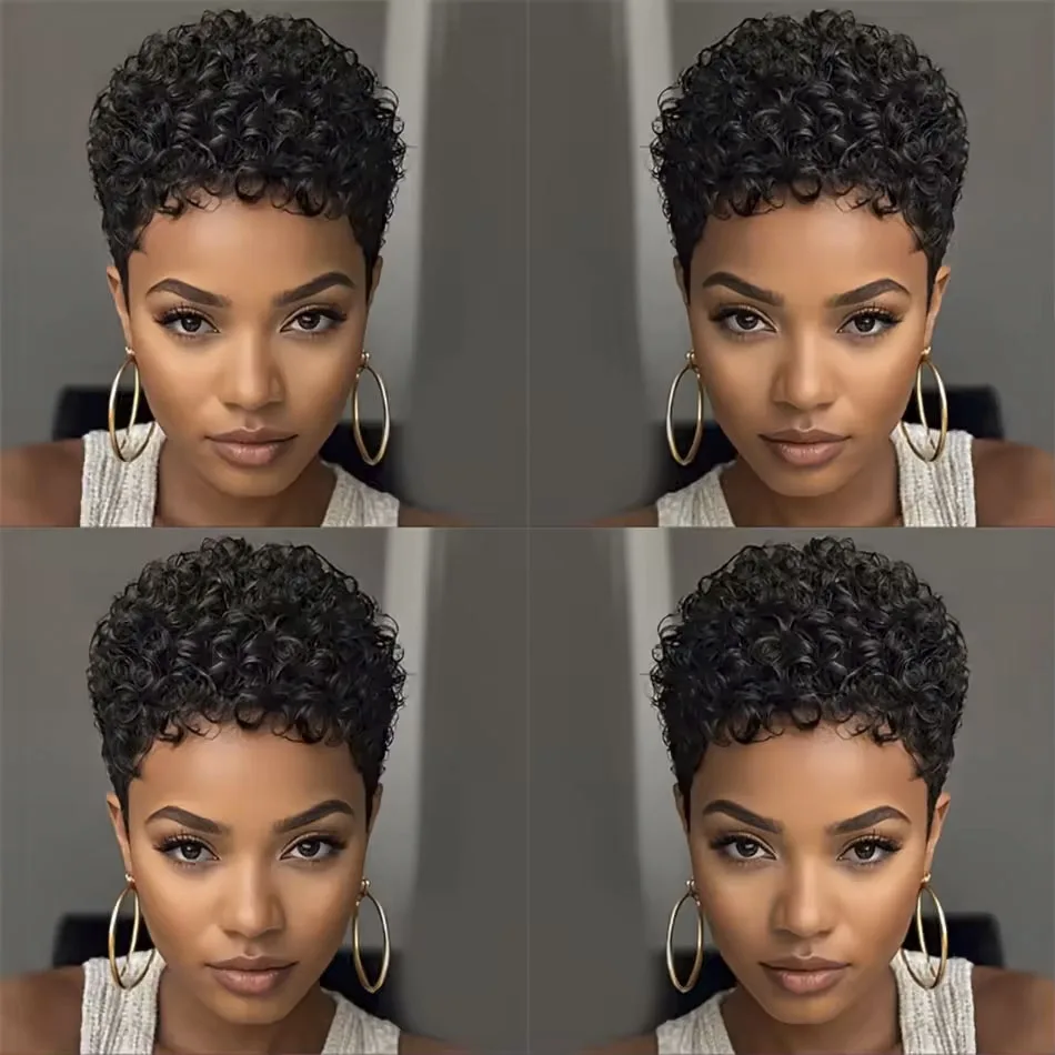 Perfeita para mulheres que desejam um look moderno, natural e cheio de personalidade, esta peruca Pixie curta combina cachos kinky curly volumosos com conforto e praticidade, sem necessidade de cola. Ideal para uso diário ou ocasiões especiais.
