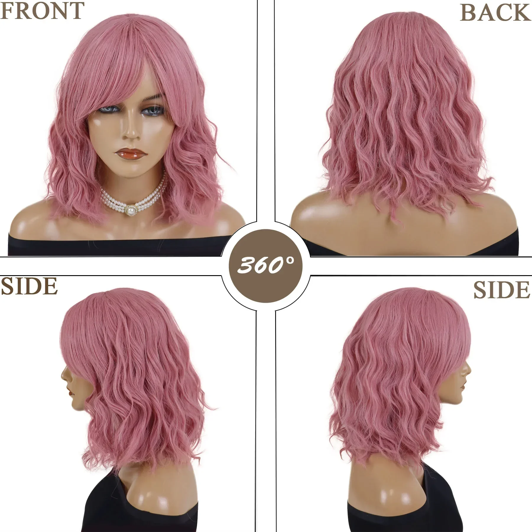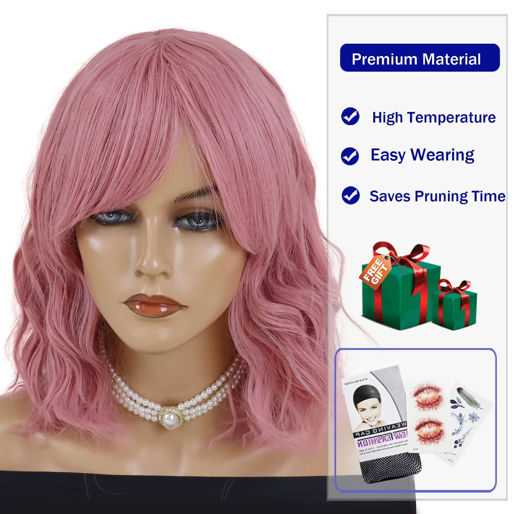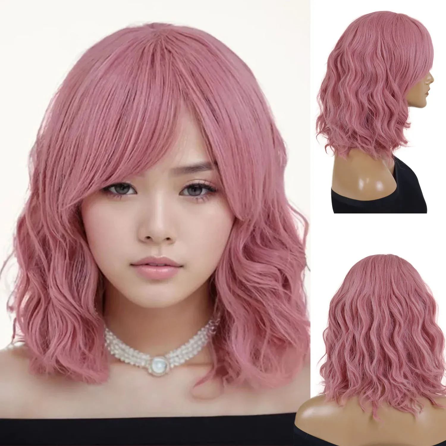 Peruca Sintética Curta Ondulada até o Ombro com Franja Lateral Rosa para Cosplay, Halloween e Festas Femininas