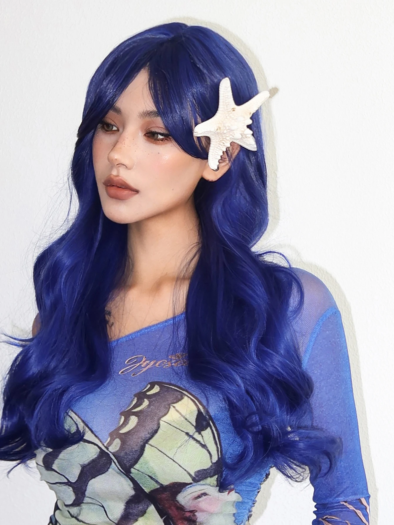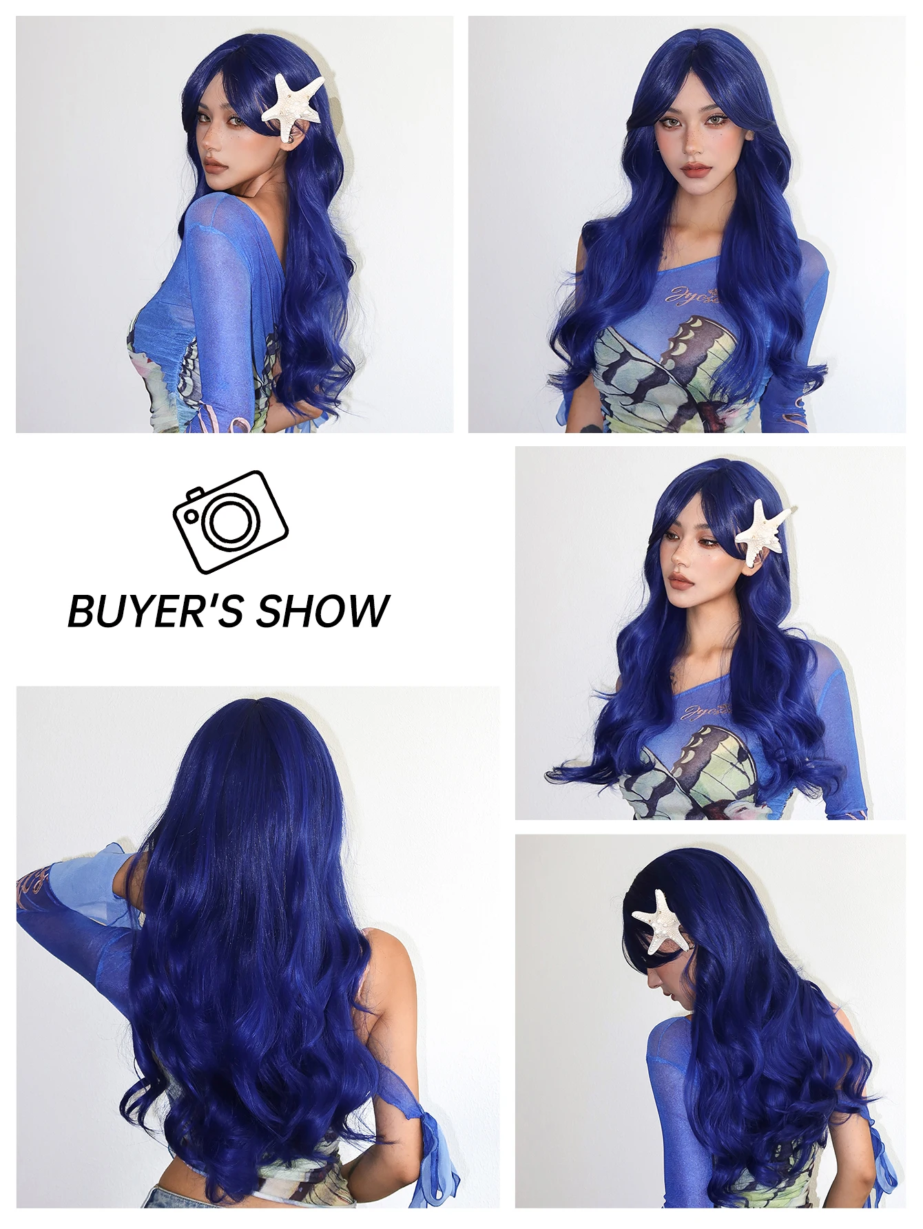 Perucas Peruca Sintética Longa e Encaracolada com Franja – Azul Profundo, Cabelo Ondulado, Resistente ao Calor, Ideal para Halloween e Cosplay | Loja dos Cabelos