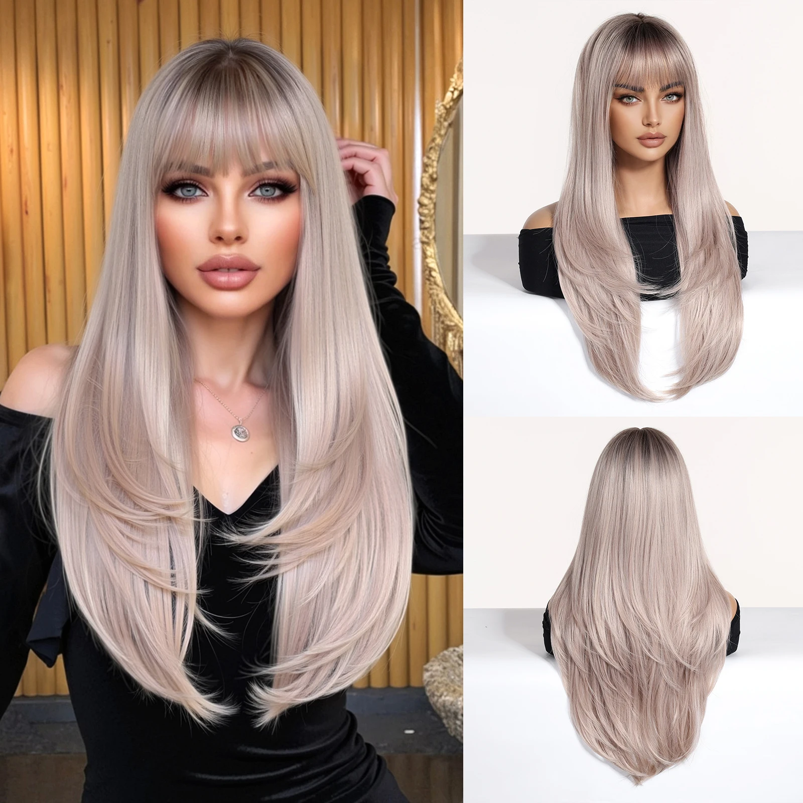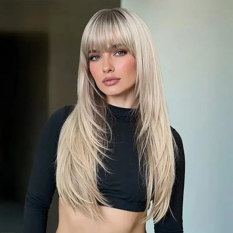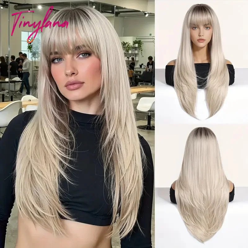 ✨ Peruca Sintética Longa Loiro Platinado com Franja Reta em Camadas para Mulheres – Cabelo Natural Resistente ao Calor, Perfeita para Cosplay, Festa e Uso Diário ✨