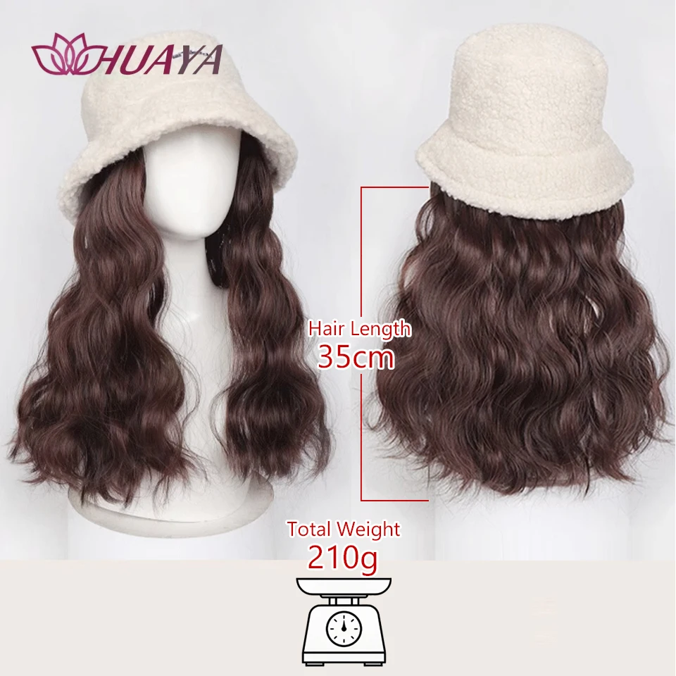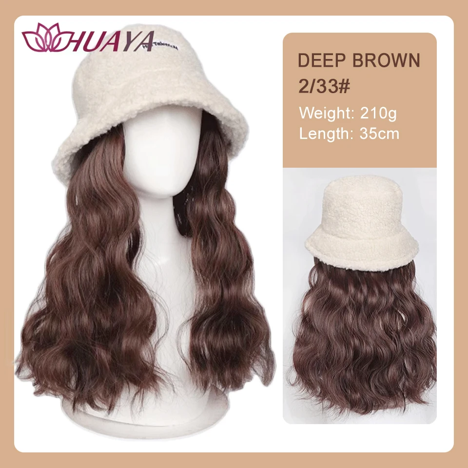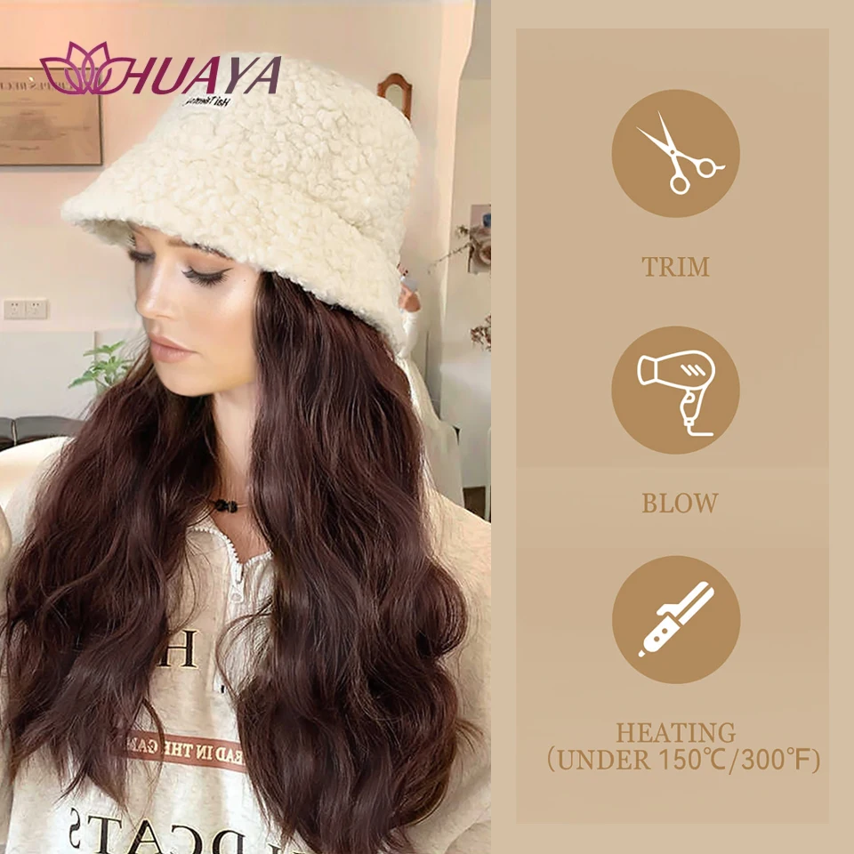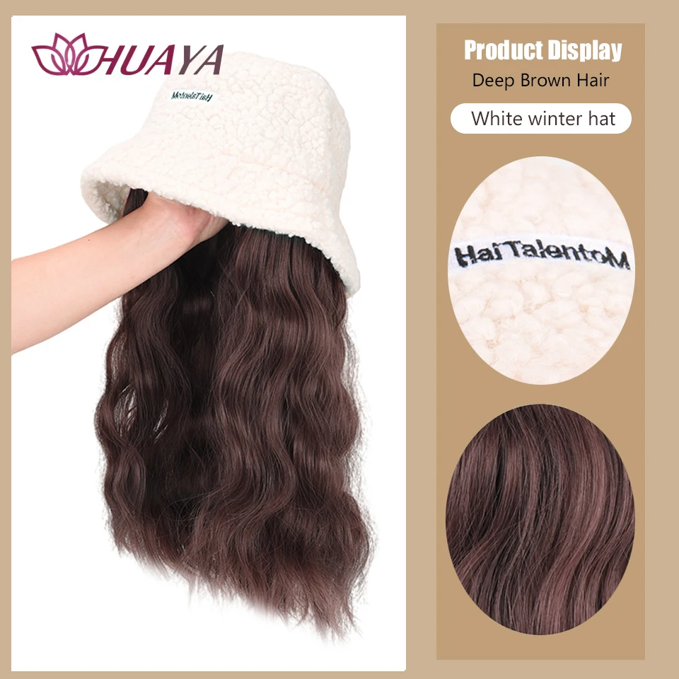 🌟 Peruca Sintética Longa Ondulada Marrom Natural com Chapéu de Inverno 🌟