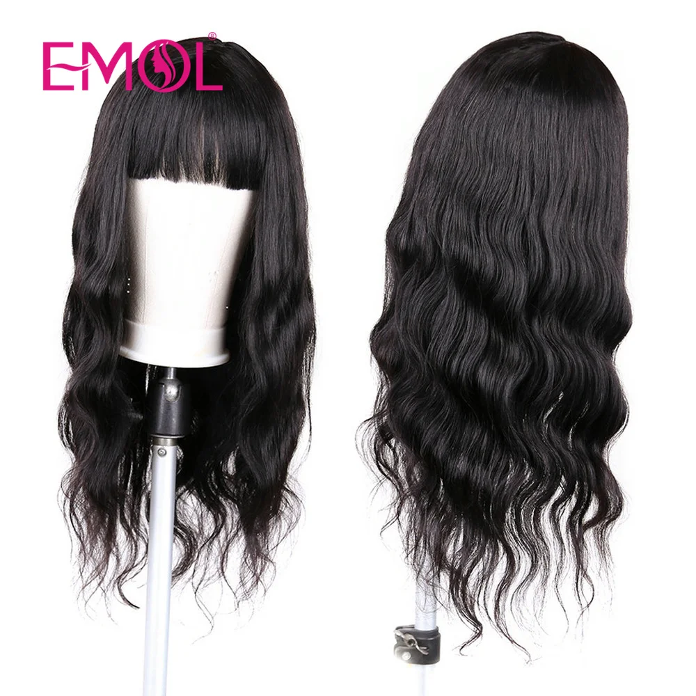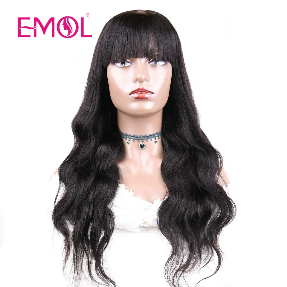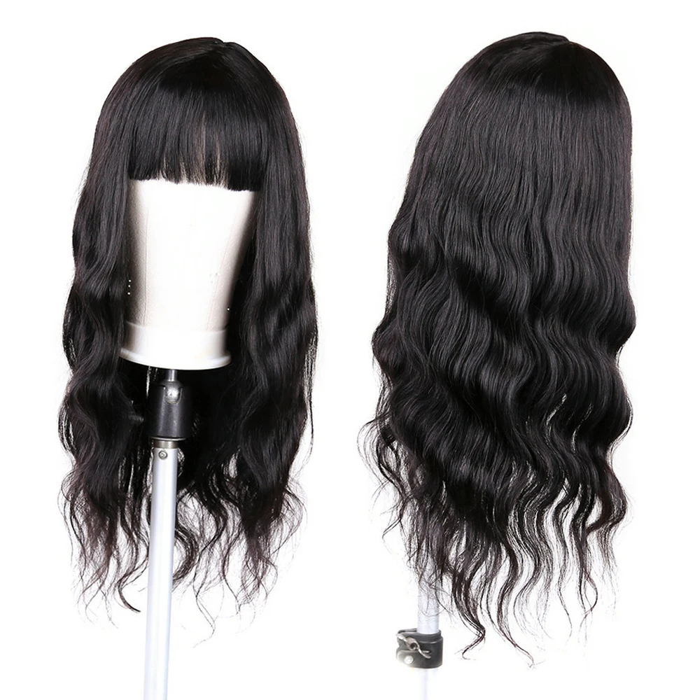 Início Perucas Mulher Cabelo Humano Perucas de Cabelo Indiano com Franja – Onda do Corpo, Máquina Feita, Remy, Preto Natural, 8-30 polegadas