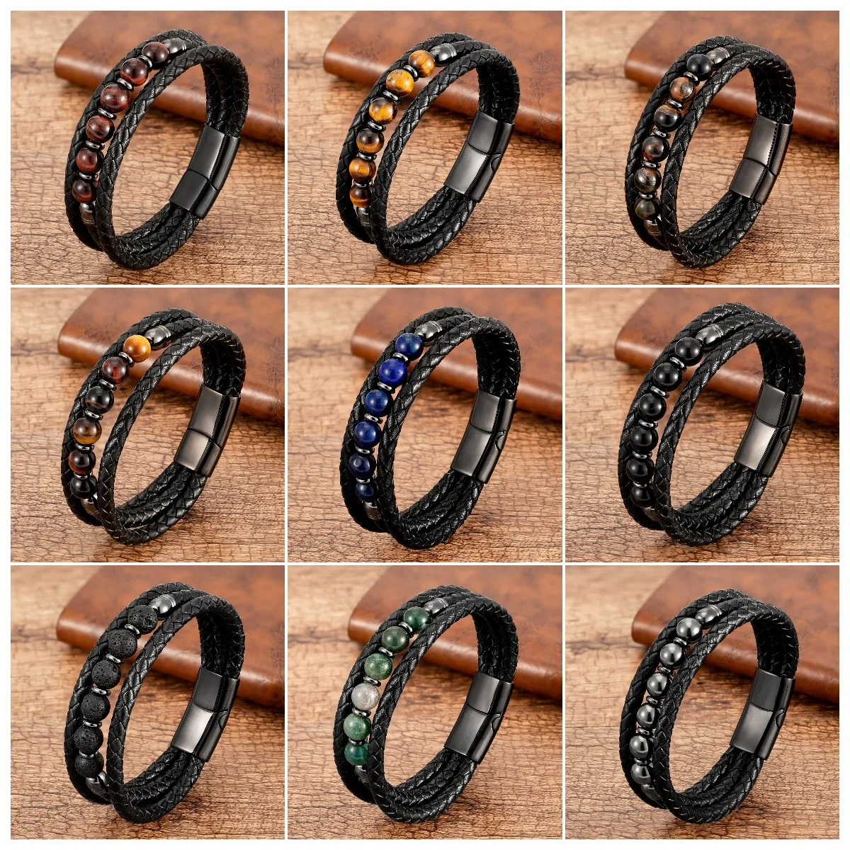 🖤 Pulseira Masculina de Couro Multicamadas com Contas de Pedra Natural 🖤
