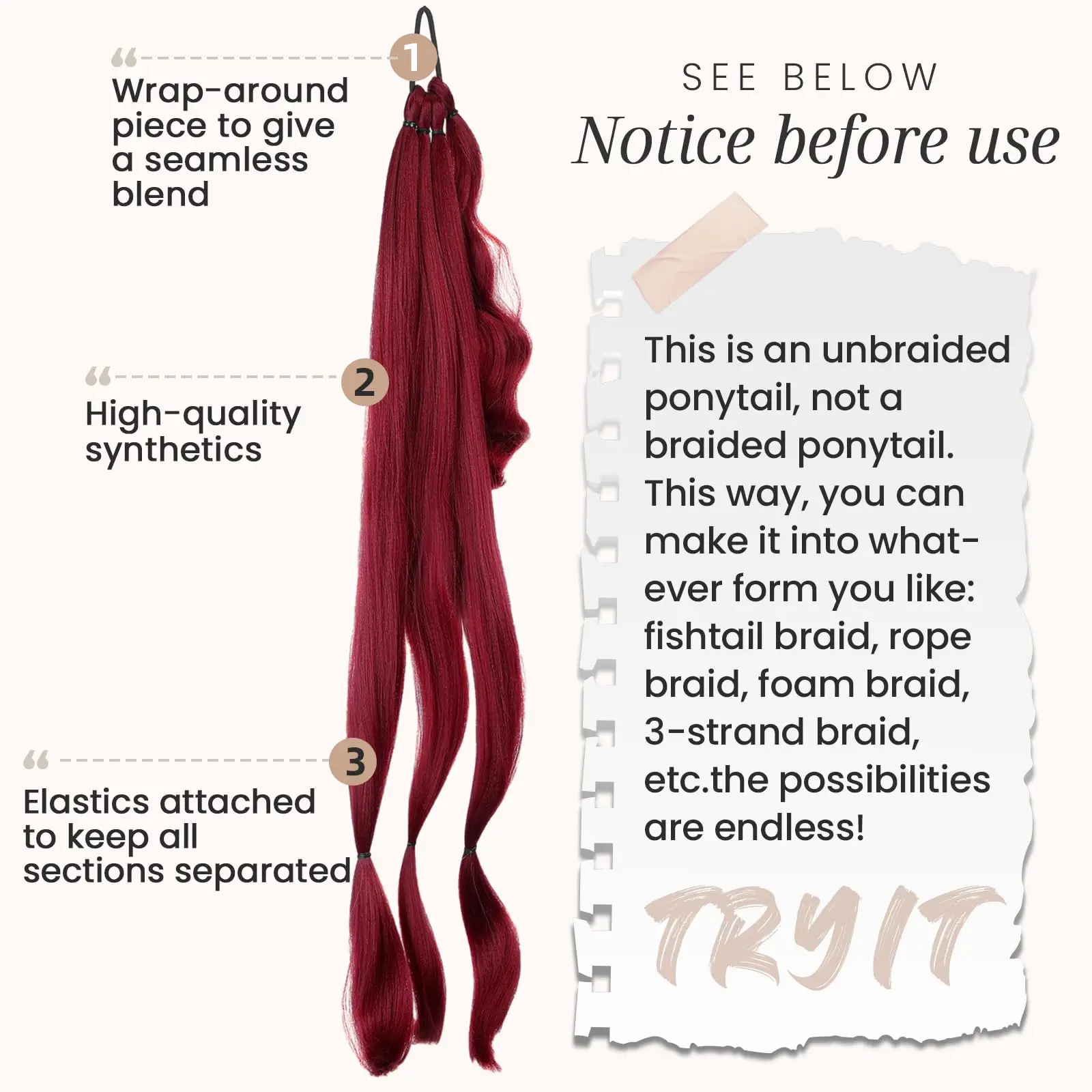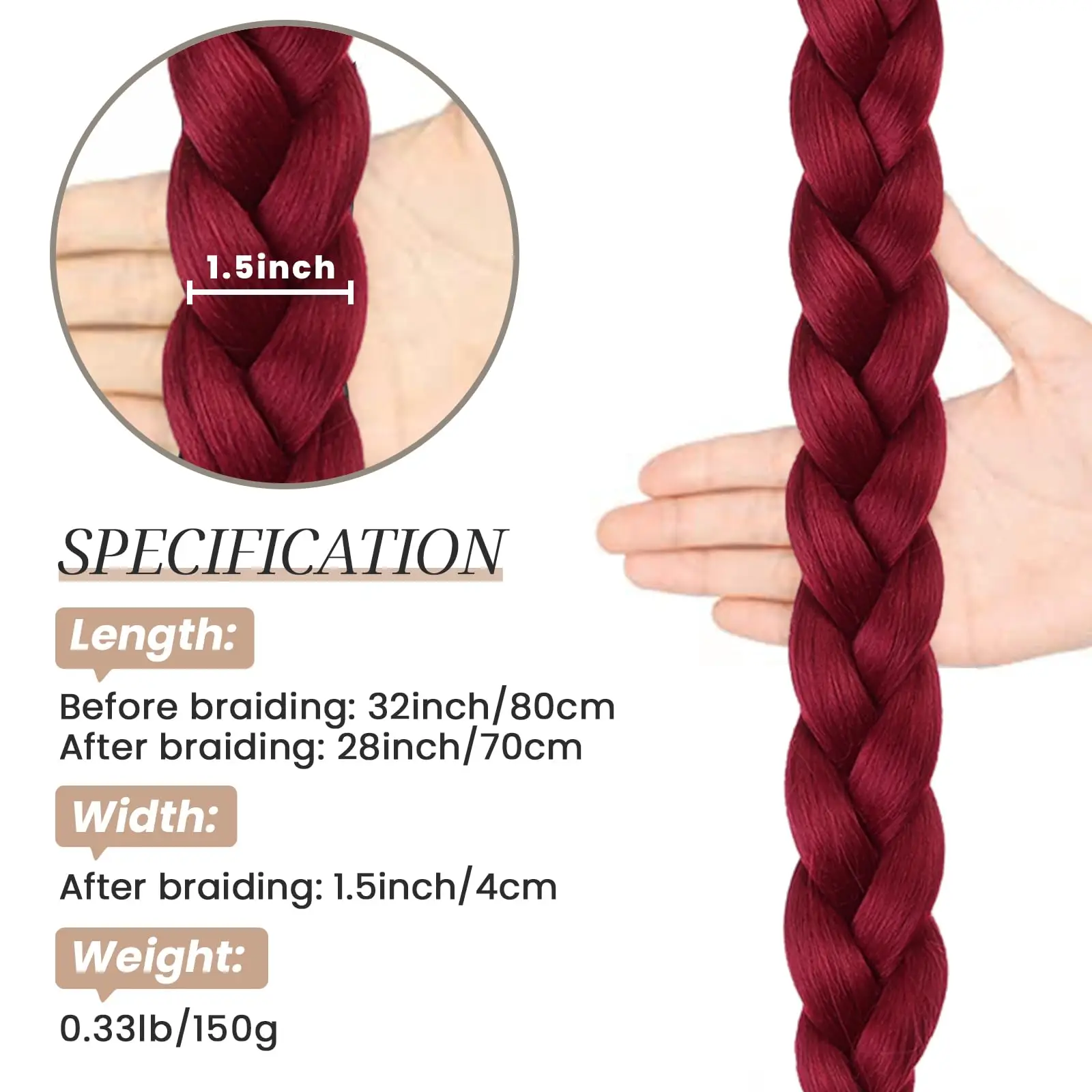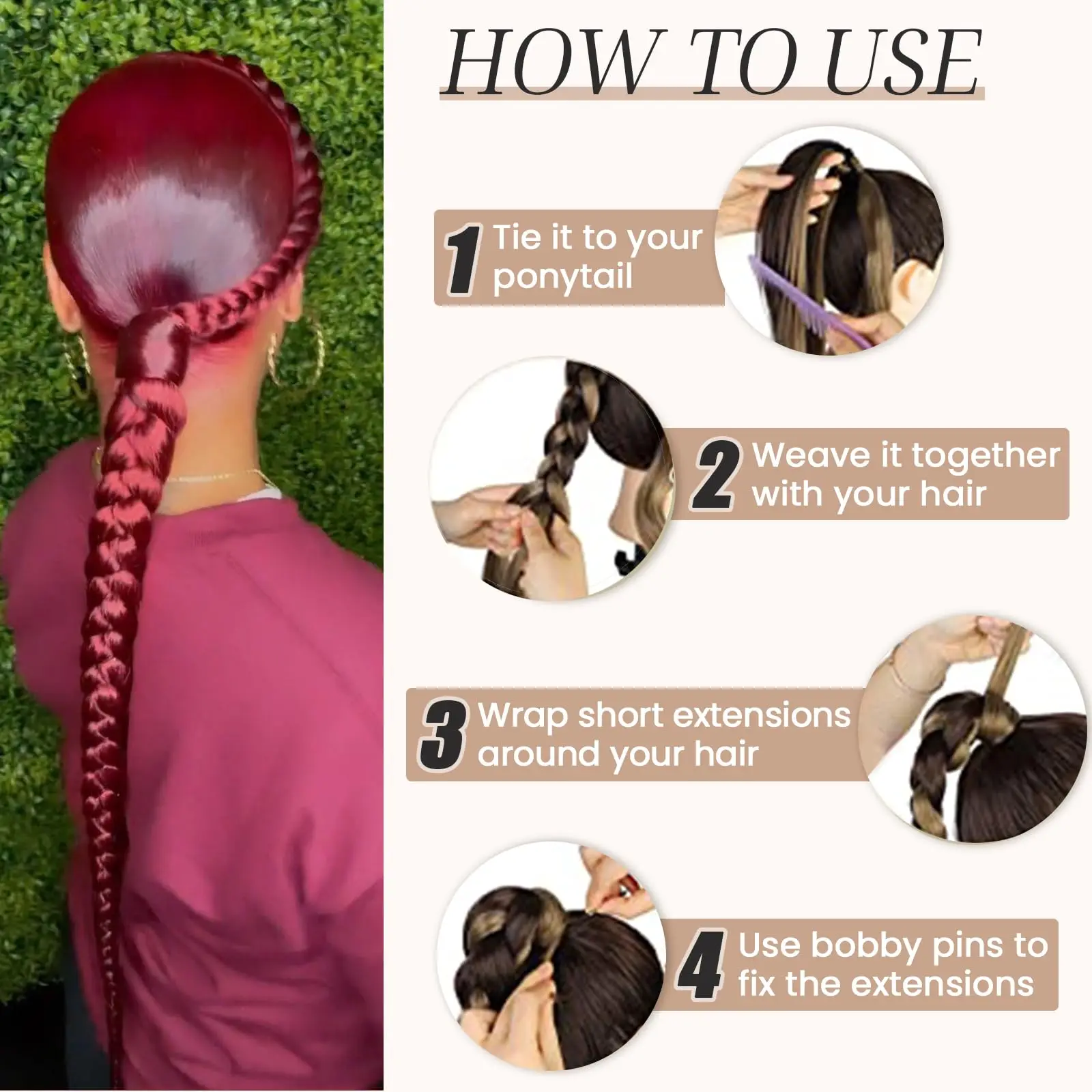 Desperte toda a sua beleza com este rabo de cavalo trançado sintético, na sofisticada cor borgonha. Ideal para quem deseja um penteado impecável, versátil e cheio de charme, perfeito para o uso diário, festas, encontros e cosplay.